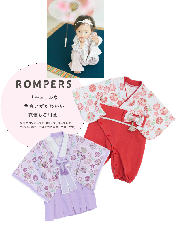 3月3日は桃の節句、ひな祭り。和風ロンパースの衣装でおめかしして、今だけのかわいらしさをたっぷり想い出に!