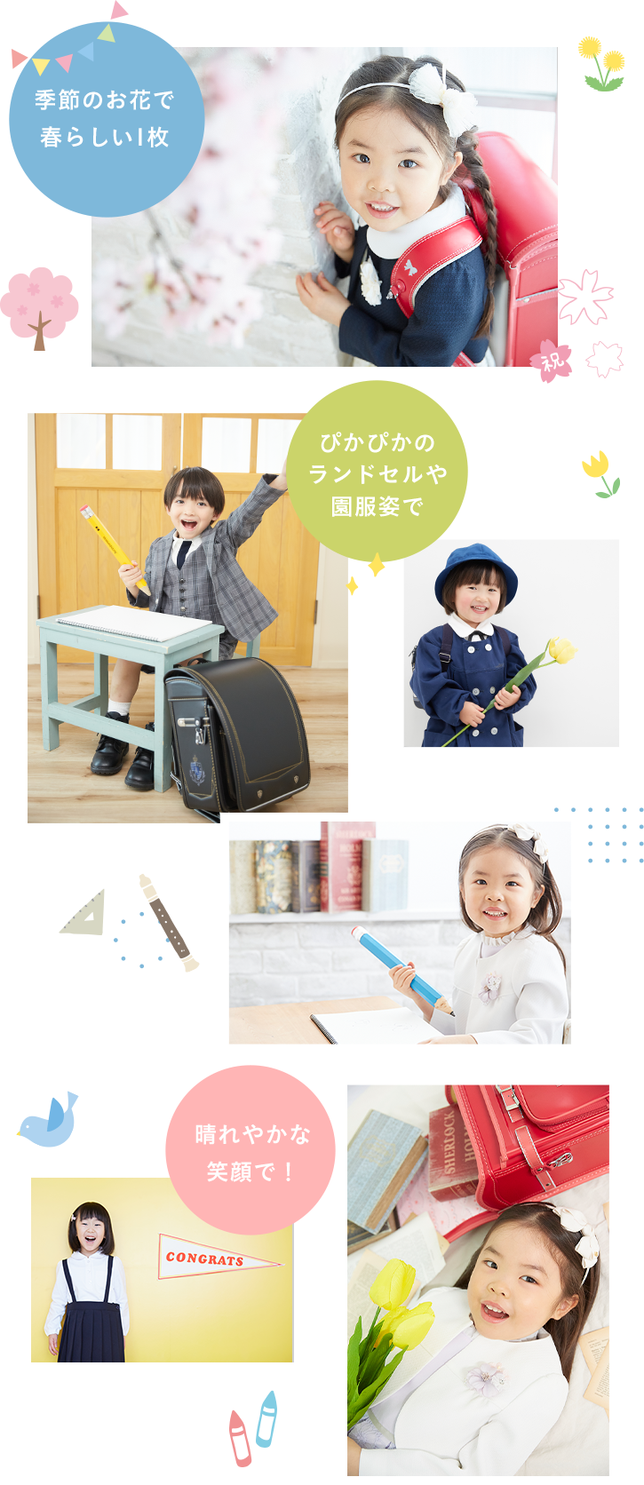 - ※ランドセルや園服はスタジオでのご用意がございません。撮影をご希望の場合は、お持ち込みをお願いいたします。