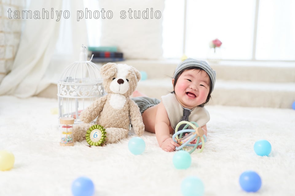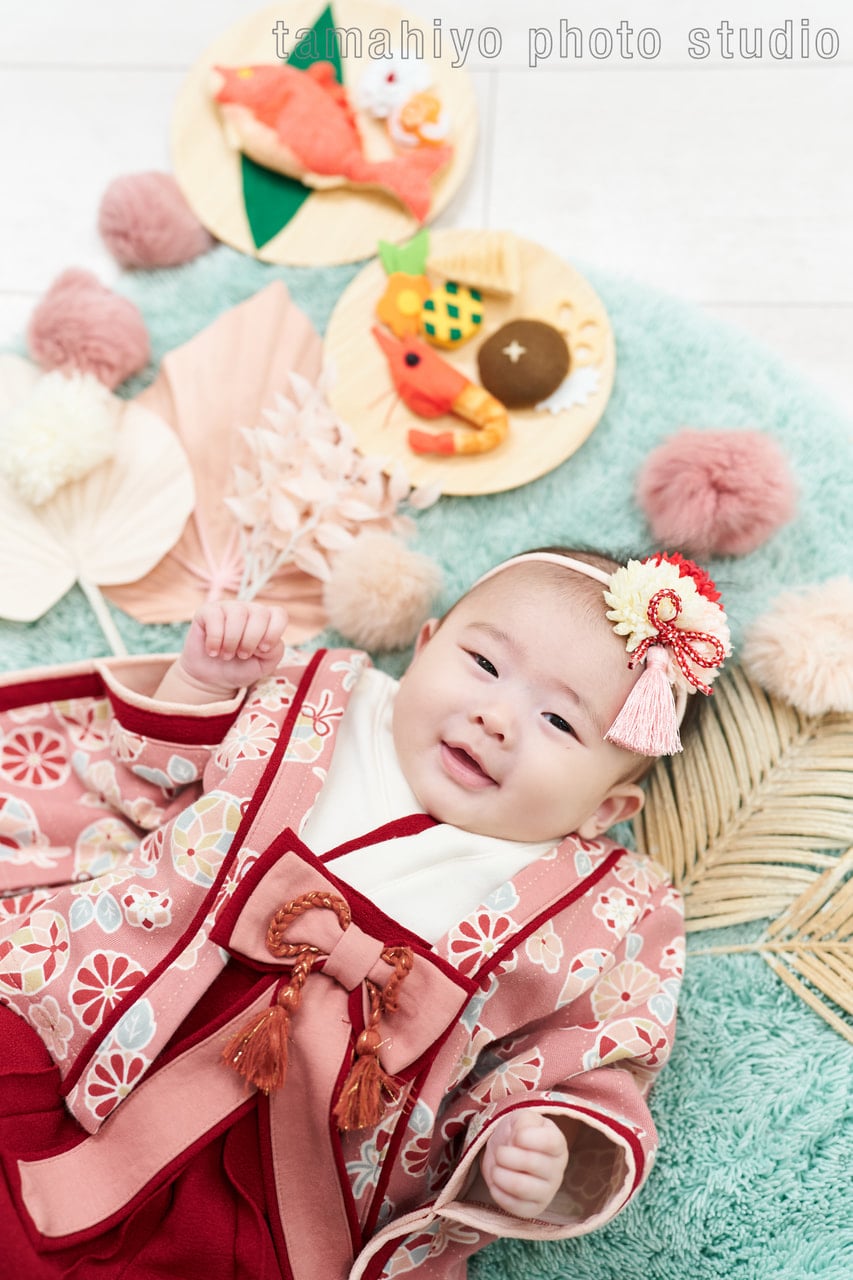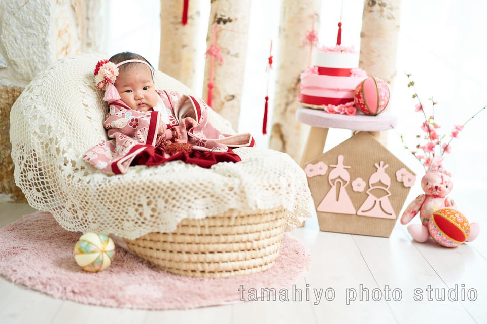 たまひよの写真スタジオでは、0歳のお子様も仰向け、うつ伏せ、おかごに入ったりと、色んな体勢でお撮りすることができます!